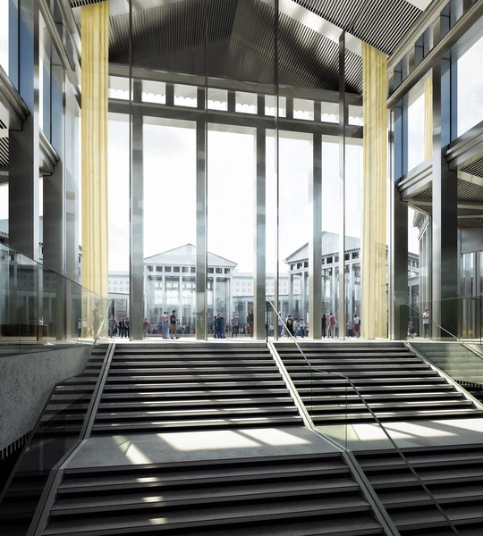 Transsolar developed a climate and comfort concept and also undertook the dimensioning of the essential technical components. For this purpose, systems were designed and functionally tested using thermal simulation and room air flow simulation (CFD). Ventilation ducts were designed in 3-D models in coordination with the architects and structural engineers. Heating and cooling is primarily provided by temperature-controlled floor and ceiling surfaces, with air systems covering peak loads.