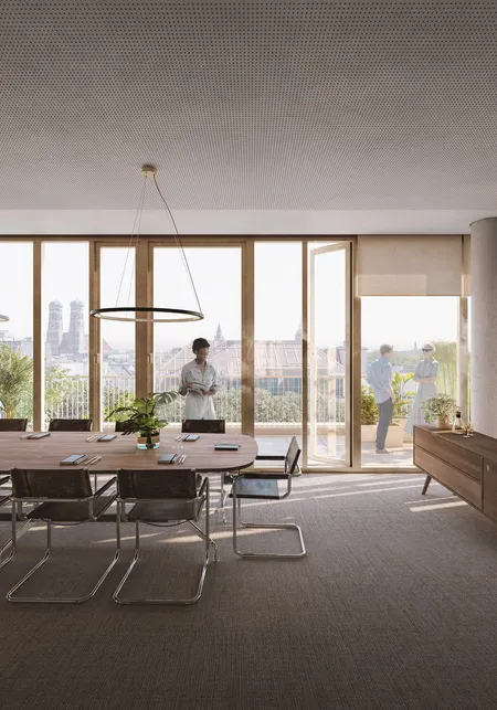 This design's central feature is a unique double facade overlooking the busy Sonnenstrasse and a thoughtfully planned courtyard. The building's climate control concept emphasizes natural ventilation, acoustic comfort, and passive solar gains in winter, providing a sustainable and efficient work environment.