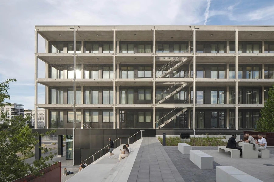The angular building 'Wood' is modularly constructed and consists almost entirely of wood. Approximately 500 prefabricated and technically pre-configured wooden modules enabled a short construction period. Additionally, the 2,600 m³ of wood sequester a CO2 load of around 2,500 tons. For fire safety reasons, the four upper floors of 'Wood' are connected via external walkways. These serve as meeting places and facilitate interdisciplinary work across floors.