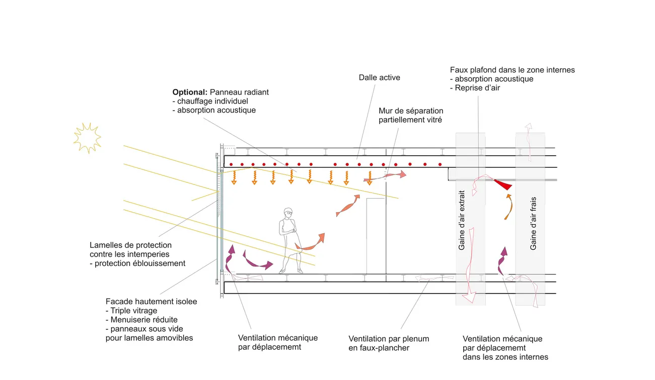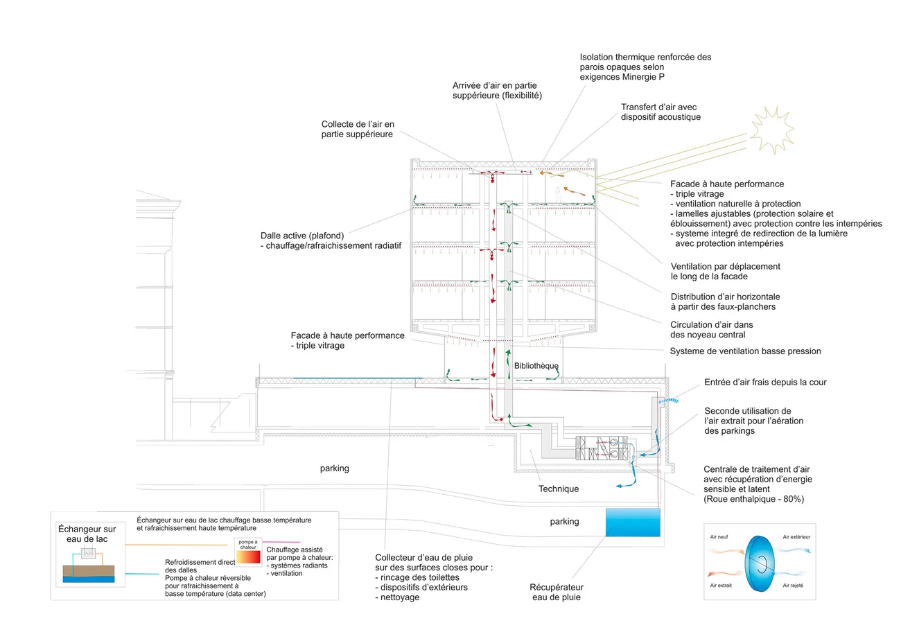 The offices are heated and cooled via a radiant ceiling. A dedicated outdoor air system supplies about 4.5 m³ /h/m² of fresh air to the offices and includes >80% sensible heat recovery. In contrast to all-air systems, the air is only mildly tempered (not significantly heated/cooled) throughout the year. The combination of radiant and 100% fresh air systems with heat recovery allows comfortable conditions with minimal energy use. A water-source heat pump connected to the nearby Lake Geneva supplies heating and cooling energy to the building. For much of the year free-cooling is possible.