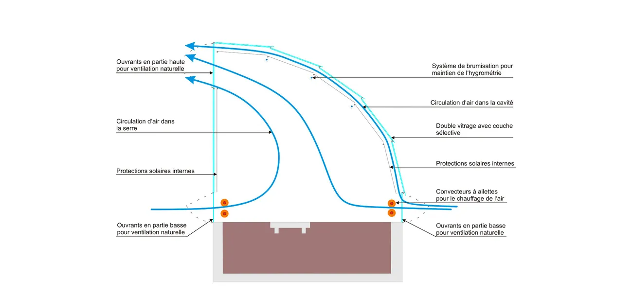The air flow and renewal will be completely natural. The height difference between the openings distributed in the upper and lower parts of the facade create a stack effect that will ensure a sufficient hygienic air change rate for the plants as well as the visitors.