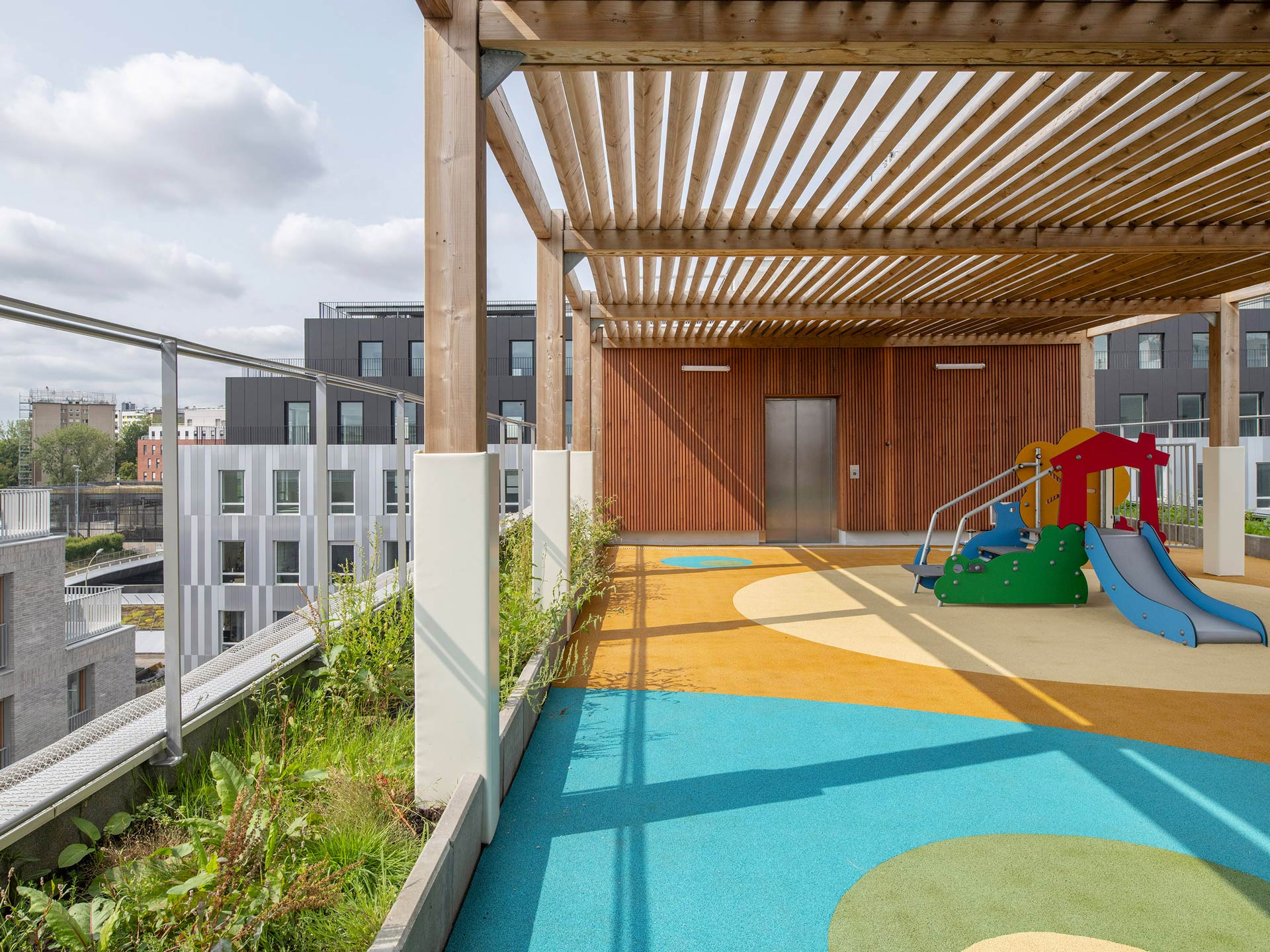 The E2 plot of the “Paul Meurice” development sector is the final stage in the redevelopment of the “Porte des Lilas” district in the 20th arrondissement of Paris. 25 social housing units are spread over two buildings separated by a central garden. The nursery is located on the last two floors of Building B and offers children a roof garden. The entire operation will be certified E3C2 (label E+C-) and BEE+ Paris. This means that the building has a very high energy efficiency and a low carbon footprint throughout its entire life cycle.
