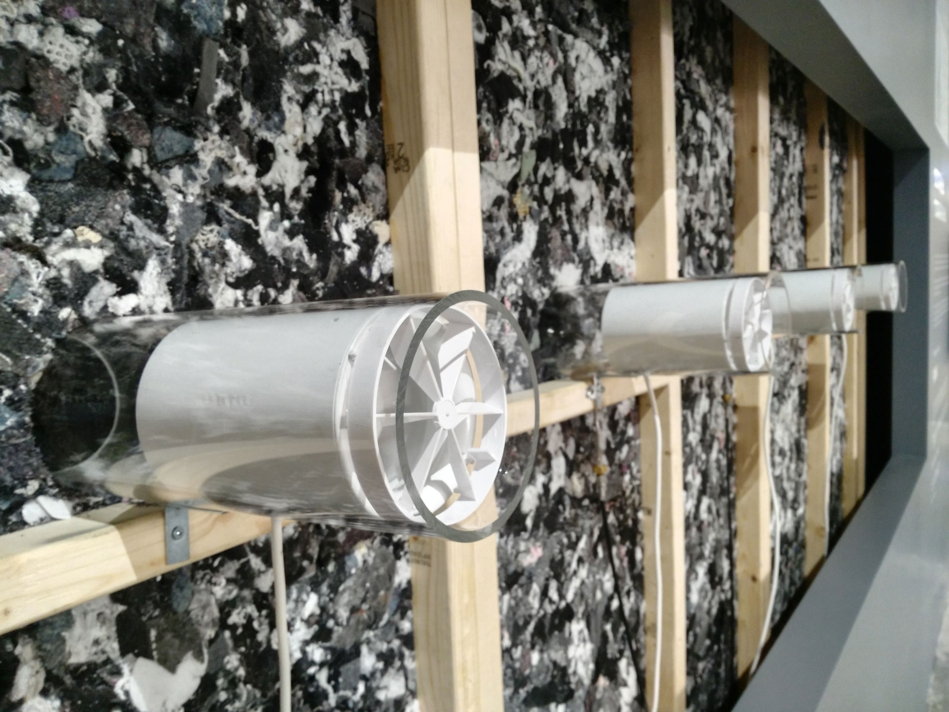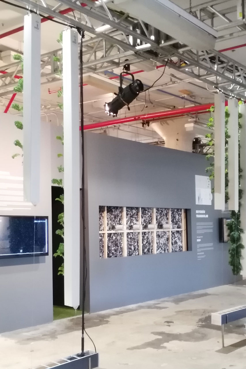 The whole concept does not require mechanical cooling. Innovative and 100% recycled acoustic absorbers, with vegetation grown on them, change the acoustical performance of the space. The dry mist fans provide air movement and evaporative cooling, reducing the air temperature while increasing the humidity. Manipulation of the environment, material, and light by using passive systems is a delicate balancing act to trick the human perception and offer a space to step outside the exhibition in a momentary escape.
