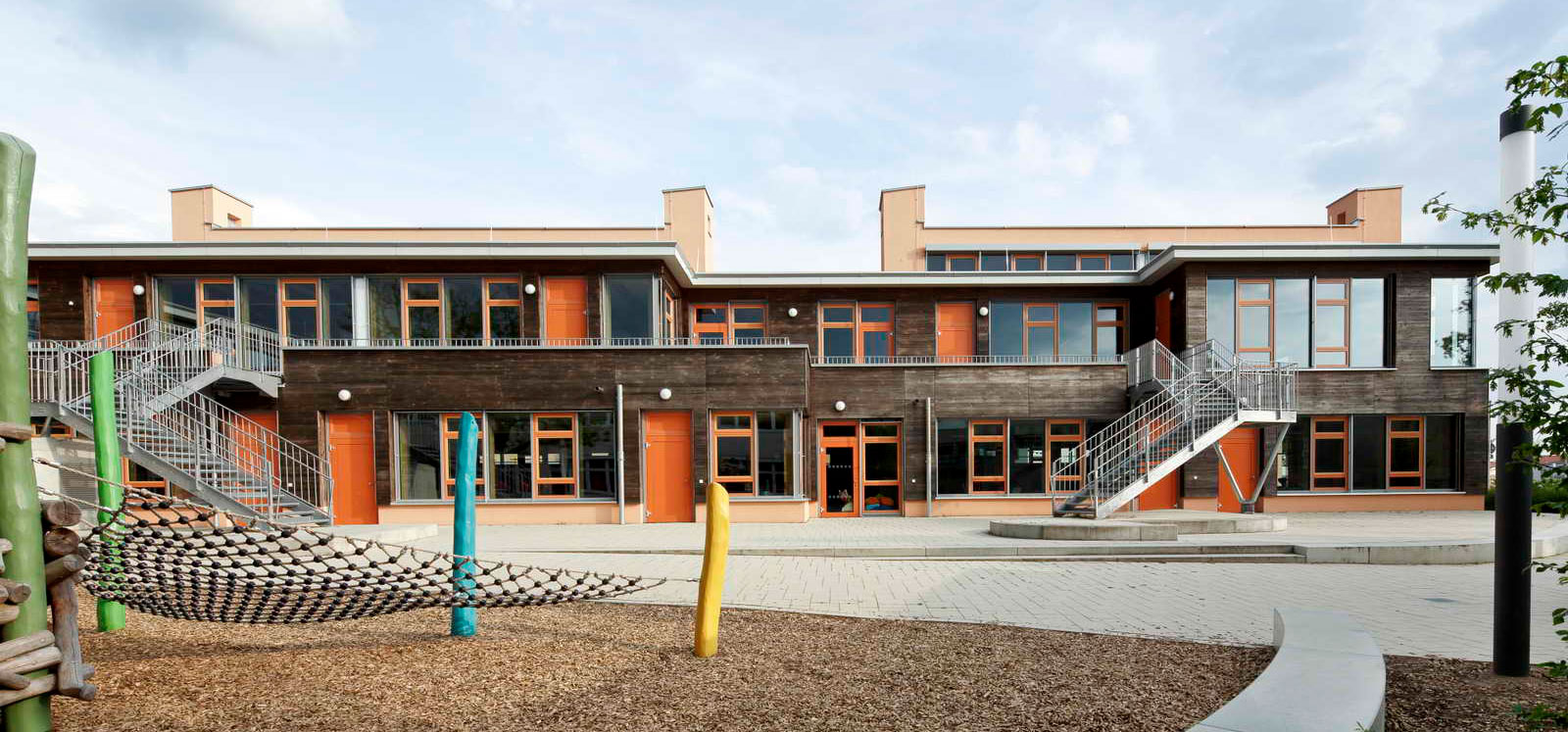 The City of Walldorf’s new “Soziale Mitte” is the link between the existing city center and the newly built neighborhood Walldorf South. It consists of four buildings which house the extension for the primary school, a kindergarten, an after-school care and a gym with canteen for all generations.