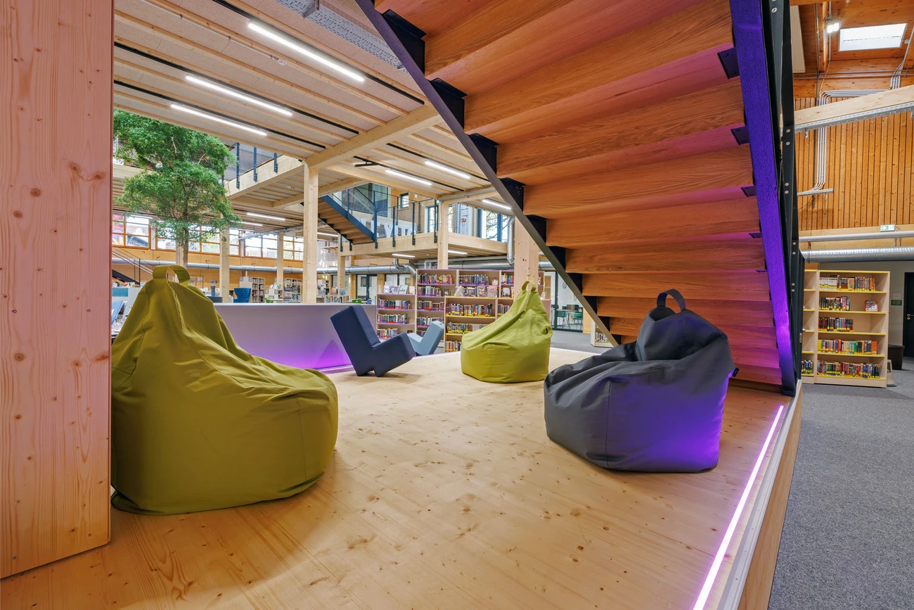 The Munich International School aimed to transform an existing gymnasium into a multifunctional center, the "Learning NeXus," a futuristic co-working space, through "simple filling." The Learning NeXus is designed to provide all the resources students need to collaborate, be innovative, and think big. On the upper, ground floor, it includes a lab classroom and four collaboration areas, as well as the IT hub and learning support. The lower level houses the library and three deep learning areas.