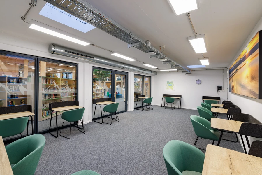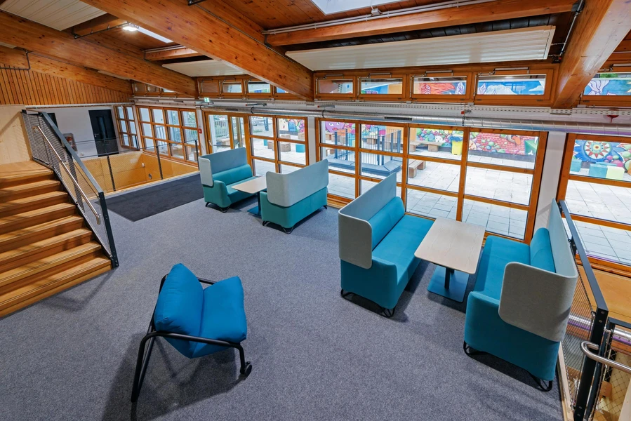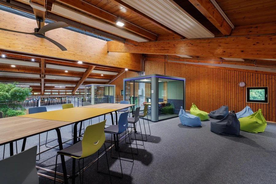 For meetings, there are teamwork boxes. These are soundproof and equipped with their own fans that utilize the air volume of the hub. This allows learners to work as independently as possible while ensuring the necessary level of supervision by adults remains in place.