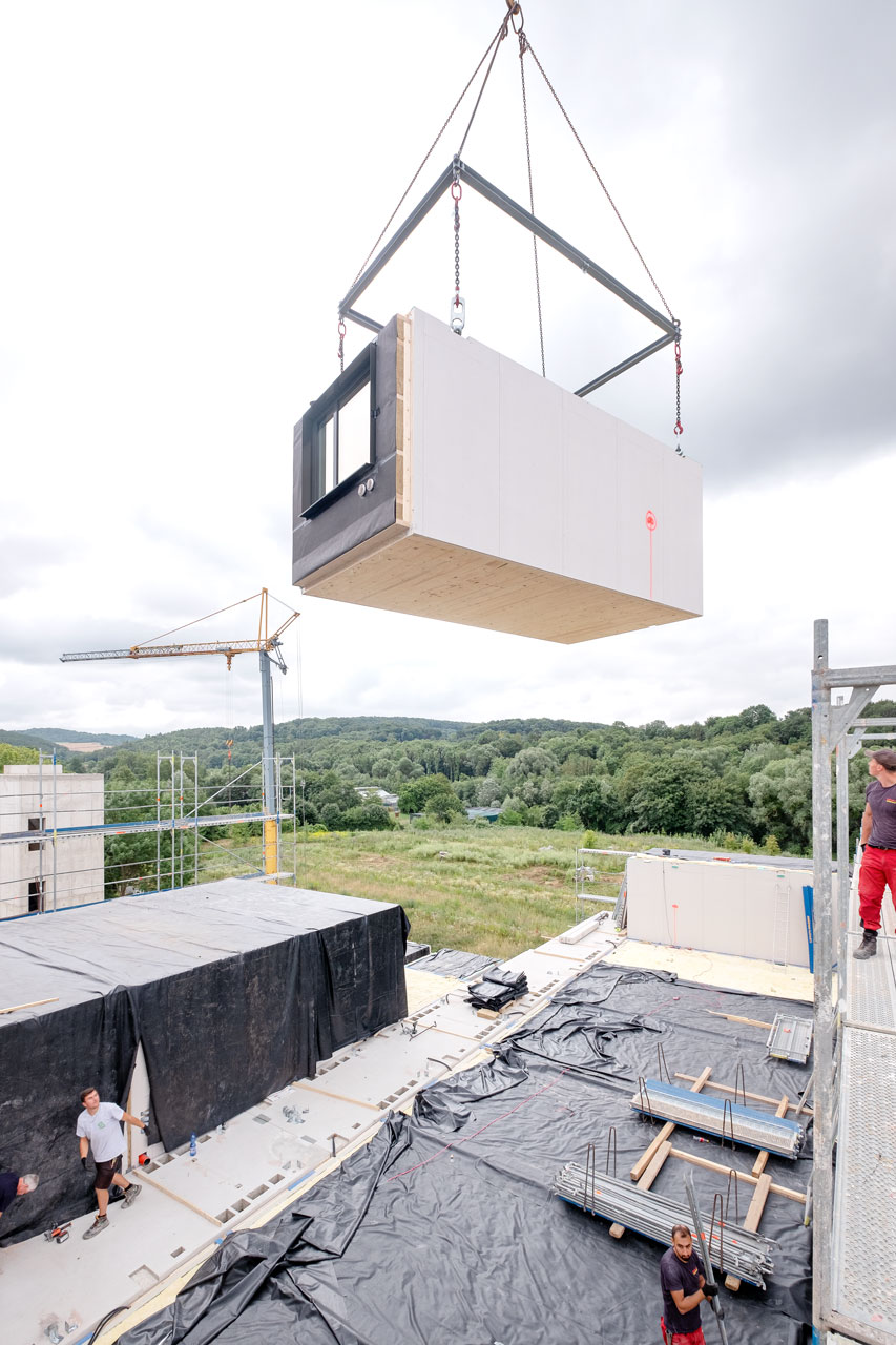 The dormitory is built in hybrid construction. The ground floor and the two stairwells were built on site using reinforced concrete. Precast concrete parts form the corridor elements with the recesses in the riser shafts. They were connected on site with reinforced concrete columns. The room modules are made of cross-laminated timber, prefabricated in the factory and equipped with a bathroom and kitchen. Stacked story by story, the ceilings thus form the floors of the stories above. The interior walls and ceilings of the modules are visible; the open wooden surfaces improved the indoor climate. Clad on the wall with plasterboard and with mineral wool on the outside, the modules comply with fire protection. Some modules face the inner courtyard, but most of them face outwards in all four directions. Connections to the building technology are each on the corridor side via a vertical shaft which opens up four modules on top of each other. The connection of the modules and the floor-to-floor partitioning took place after the room modules were placed. The decisive factor for connecting the modules was the choice of an approved piping system in which a mixed installation of flexible but flammable plastic pipes for installation in the modules and metal pipes in the risers could be combined. Contrary to the original approach, the ventilation takes place with pure exhaust air via the bathrooms and a subsequent flow via windows or, with closed windows, via outside air outlets in the facade near the radiators. The building is supplied with heat from the university's local heating network.