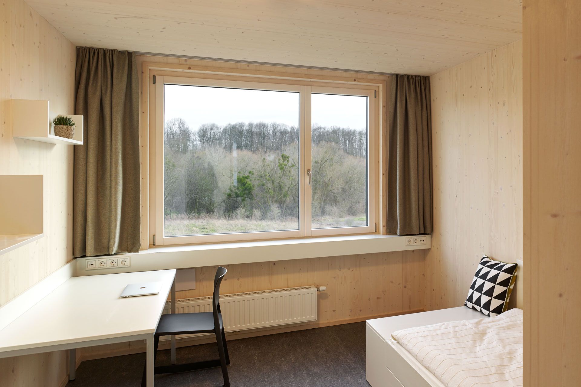 The new dormitory building on the university campus is a five-story building with an inner courtyard and offers living space for 264 residents. On the ground floor there are property management, multi-purpose room, music room, tutor room and laundry room, as well as four residential units supplemented by a communal terrace. The four floors above contain 260 compact 18m² residential units, each made up of a prefabricated room module made of cross-laminated timber elements, which resulted in a short construction period. Each unit has its own wet room and kitchen unit. The wooden surfaces in the interior offer a healthy room climate and a warm and quiet living atmosphere.