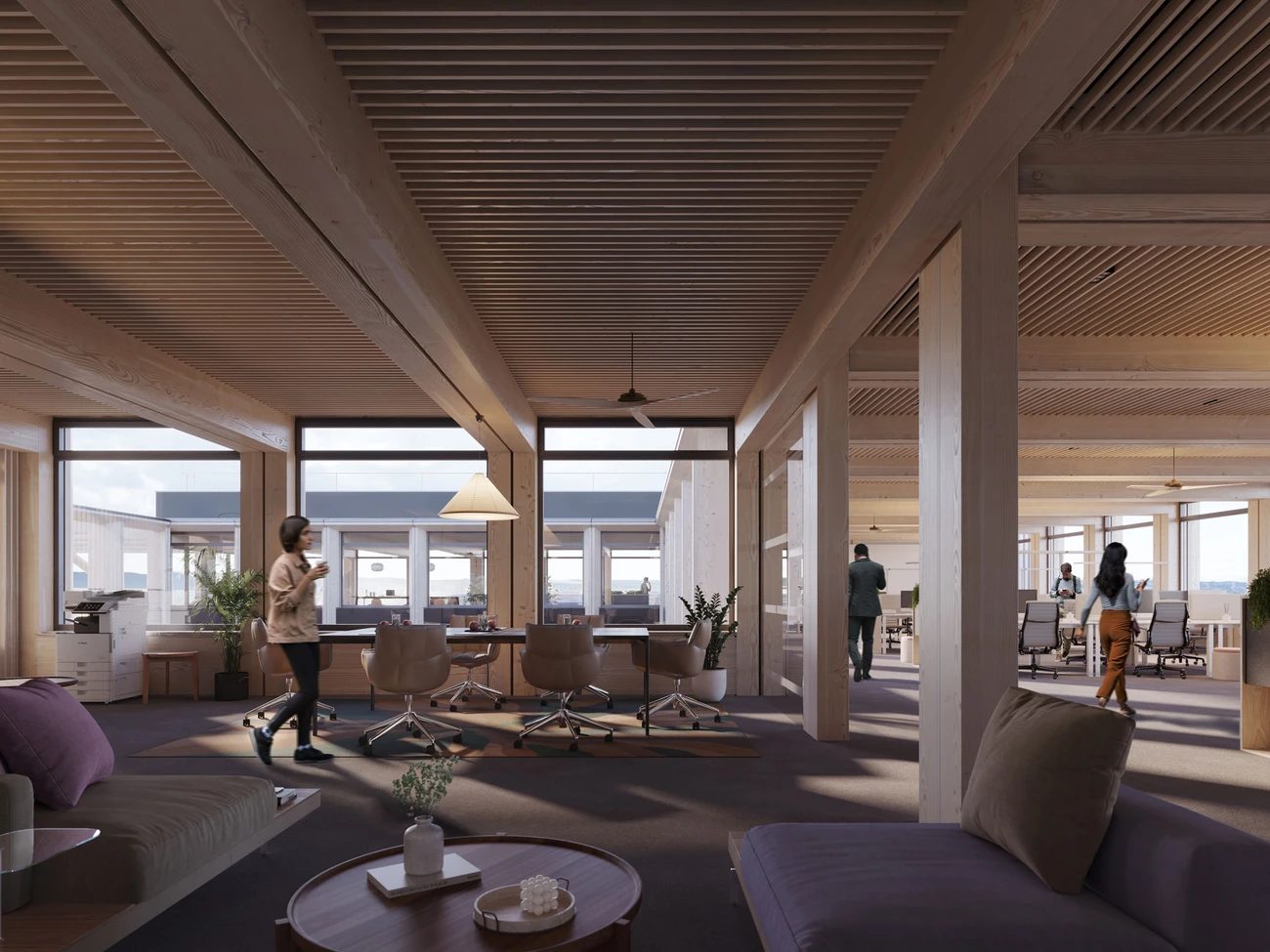 The first floor is designed as a classic wooden building and houses meeting rooms of various sizes, a canteen with a full kitchen, and a fitness area.