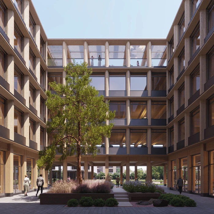 The four upper floors will be constructed in timber. The space program, the occupancy, as well as the flexibility of these office spaces were optimized in order to be able to implement the goals of a robust climate and energy concept. Low technical installation density, promise lower operating and energy costs with high quality of stay.