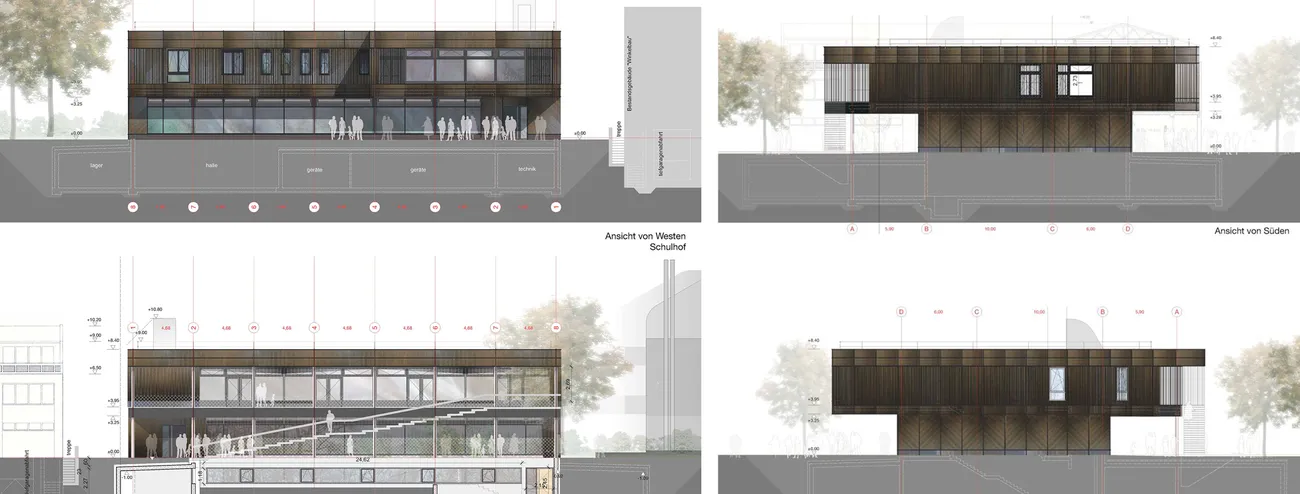 Local renewable energy generation via photovoltaics on the roof provides electrical power. The area is just barely sufficient to balance the energy use of the building. Transsolar therefore recommends that the connecting roof between the gymnasium and the adjacent school be additionally covered with PV modules.