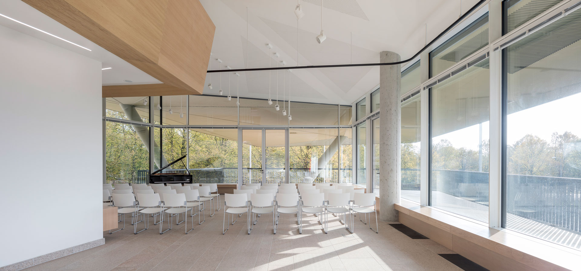 The foyer is heated via underfloor heating. The heat pump system makes efficient use of geothermal energy via water-carrying pipes integrated into the foundation piles. This system provides heating in winter and cooling in summer for room conditioning. The main hall and foyer receive daylight via the facades and skylights. Displays provide users with feedback on current energy consumption and conditions in the respective room.
