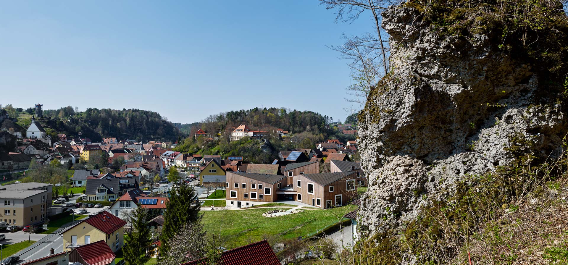 The research campus of the Fraunhofer Institute for Integrated Circuits IIS was built at the edge of the medieval city of Waischenfeld in the idyllic landscape of northern Bavaria. One of the houses is equipped with conference rooms for seminars. The other three are structured horizontally in offices and laboratories on the ground floors and guest rooms on the upper levels. The building parts are connected centrally by a flat-roofed timber truss-work, which encloses the central event space punctuated by triangular skylights providing an all-weather connection. The close connection of living and working in this secluded area creates a focused, yet communicative atmosphere in which project teams can meet, work and do research while sharing an intensive exchange.